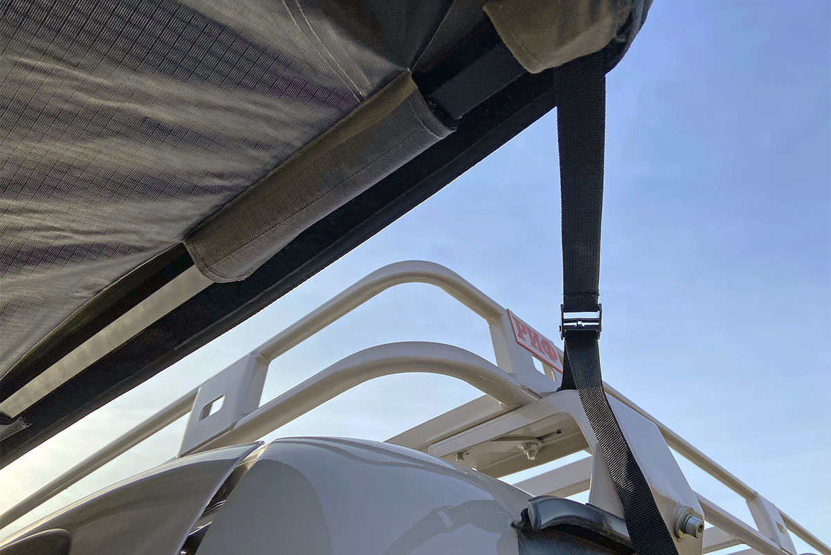 Добавив стенки, можно получить удобное укрытие, где можно разместиться всем экипажем в случае непогоды. Большие окна и дверь имеют москитные сетки, защищающие от насекомых и позволяющие наслаждаться отдыхом на природе