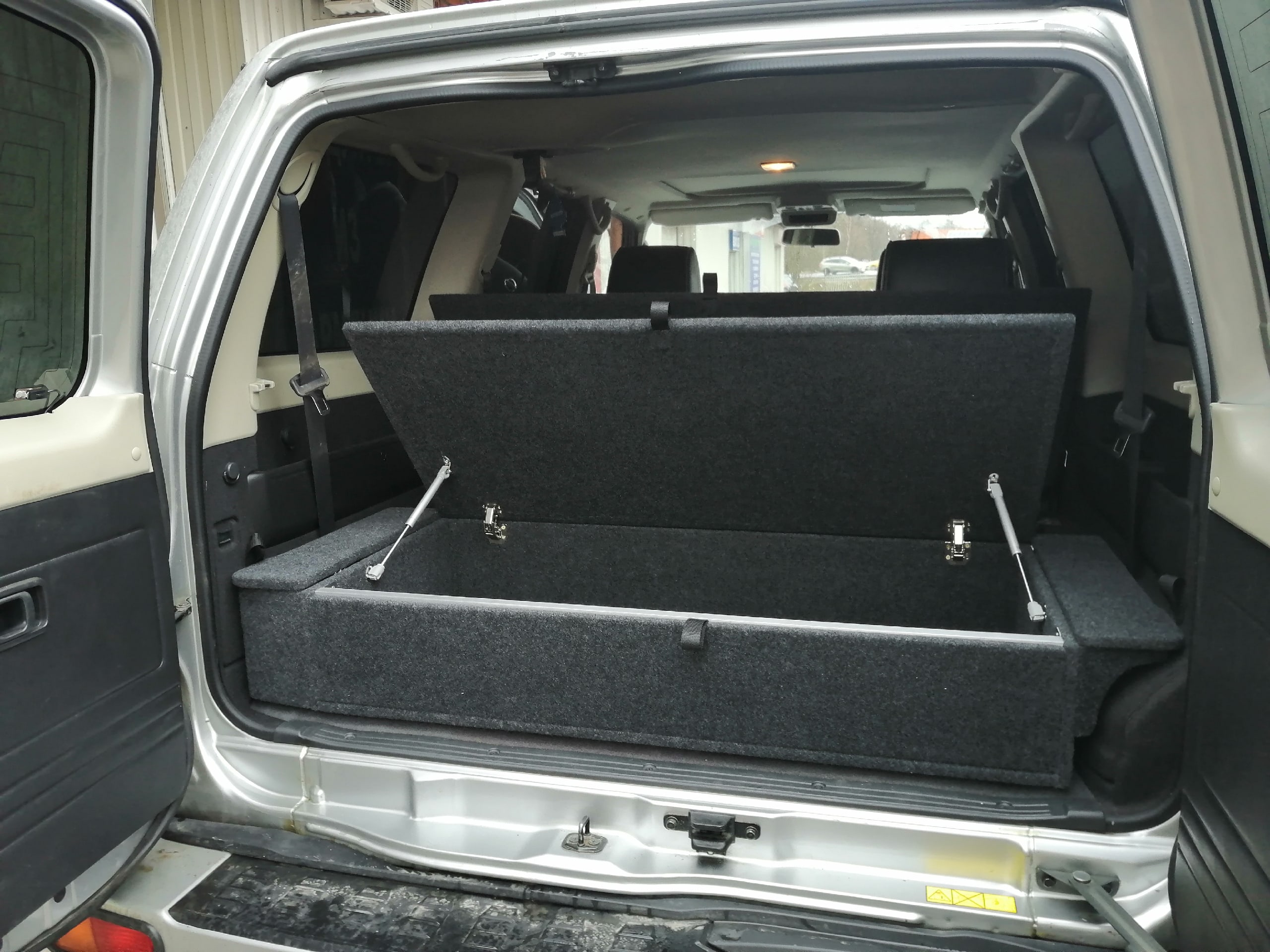 Органайзер-спальник позволяет убрать стропы, огнетушитель, аптечку, компрессор и т.д. в свои просторные ящики. При сложенных спинках задних сидений образует ровный пол, можно обустроить спальное место.